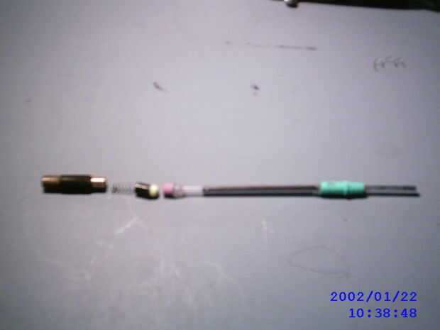 Empezar por epoxying la válvula schrader en un extremo del tubo pluma. A continuación, inserte el émbolo (casquillo de extremo de la pluma con Balas-Softair bb y resorte unida). Luego ponga la pieza de válvula en (el tubo con una goma de borrar y el frente una pluma), esto en lugar de epoxy. Continuación, inserte el barril con el orificio dentro del tubo pluma.