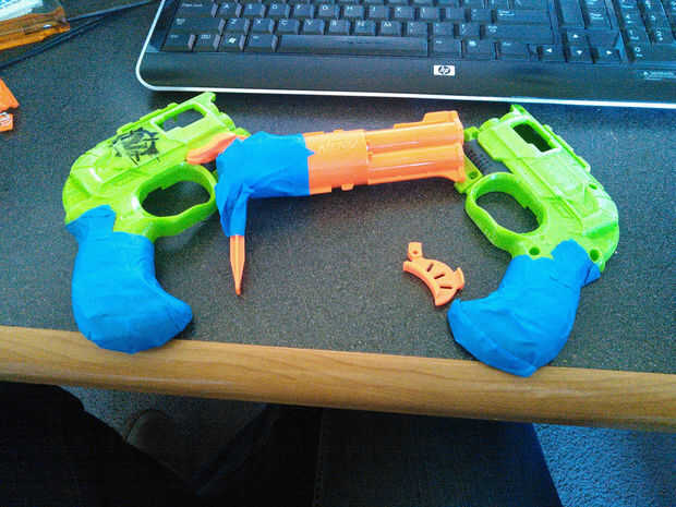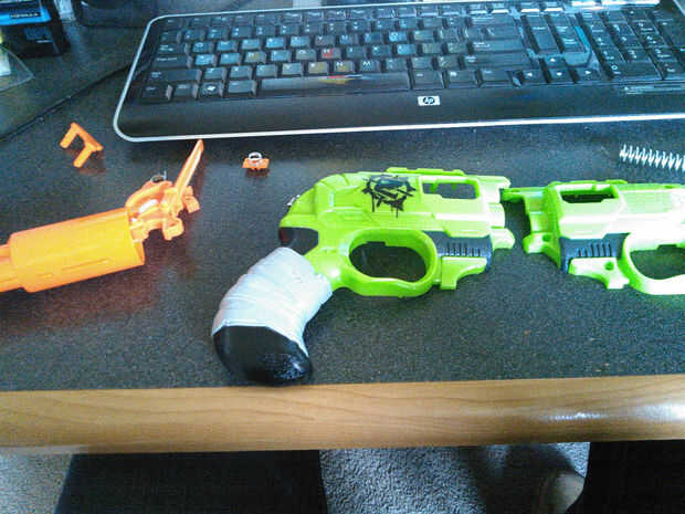 Por último, pegado las piezas que iban a ser pintado. Asegúrese de que la cinta sobre los mecanismos reales de la pistola si quieres para más tarde. Esto impide que la pintura engomar para arriba el funcionamiento interno.