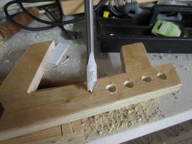 Tomar tu 1/2" broca y perforar la" munición "en el lado de la pistola. Usé los dardos de cabeza negra/whistler para esta arma. Estoy seguro de que otros dardos también cabrá en estos agujeros de 1/2. Intenté hacerlos todos en una línea recta, pero (como se puede ver) no pegué bien la marca. Bueno, no gran cosa, un niño no va a cuidado recto cómo son los agujeros.