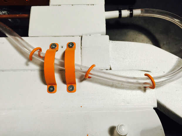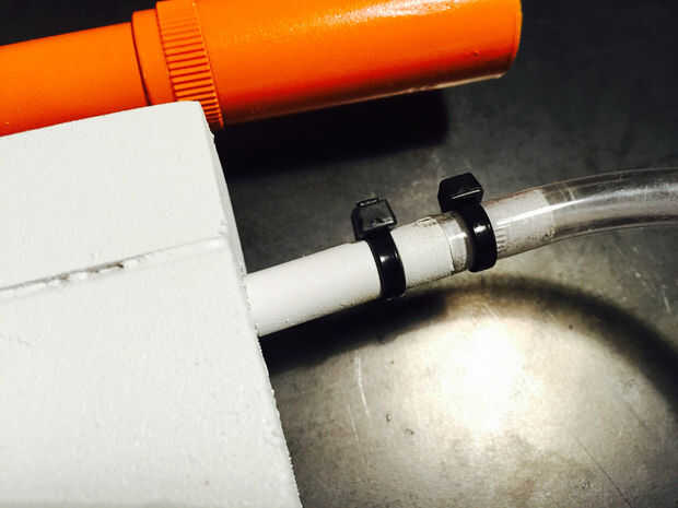Ganchos y soportes aseguran el tubo de vinilo en el lugar, con seguridad fuera de la trayectoria de la flecha. El extremo del tubo se fija con abrazaderas de plástico para una conexión de la barra de flecha. Una cubierta de la válvula de bicicleta también se agrega para la estética y seguridad.
