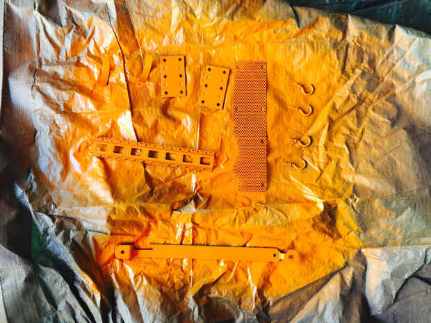 Un montón de piezas de metal acento, incluye ganchos para sujetar el tubo de vinilo y un montaje del alcance, eran aerosol pintada de blanco y luego brillante naranja.