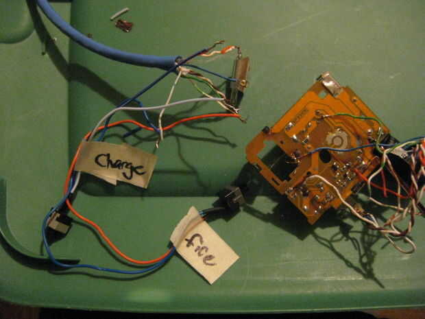 El próximo es el interruptor del cargador que carga el circuito. En el circuito es un botón de metal brillante que carga el flash pero si empuje con el dedo directamente dará una sacudida eléctrica te. Había soldado un cable a cada contacto que pasó al interruptor y soldar un interruptor en el extremo del alambre.
