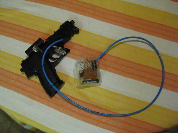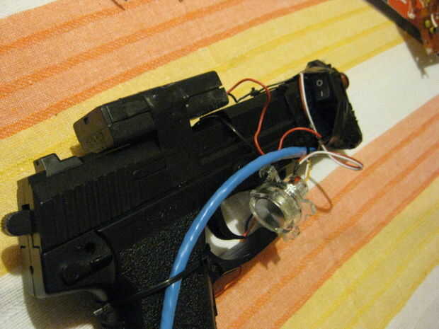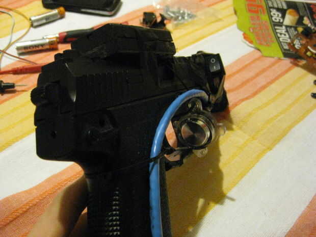 El láser es atado en la parte delantera de la pistola y por cable a la caja. Hay un pequeño interruptor negro en el lado del barril que enciende y apaga el láser y también la luz de fondo de fuego interruptor enciende y apaga también. El interruptor fue cosechado de una fuente de alimentación quemada y puede manejar la carga de la salida de núcleos nucleares, por lo tanto su perfecto.