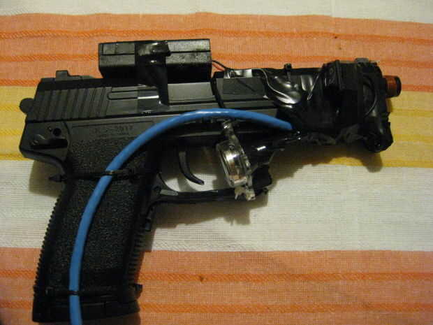 Después se ejecutan todos los cables y todo está asegurado, abrigo del encogimiento del calor y el cableado a la pistola a prueba de agua y hacerlo principalmente todo el color de un... La pistola se hace ahora y listo, ahora para completar el sistema haciendo una caja para el circuito de goma de borrar de la memoria.