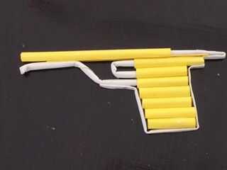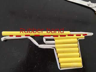 Tire la paja blanca superior con banda elástica por detrás y dejar que el borde del resto paja doblado en el borde de la paja 2. Inserte la bala dentro del cañón.