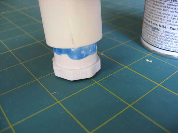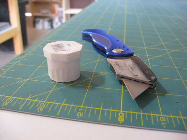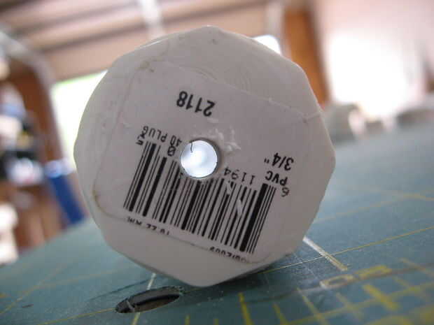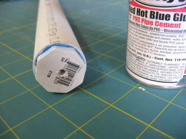 Use una navaja para afeitar cuidadosamente hacia abajo el enchufe por lo que se ajusta en el tubo de 1". Cemento de PVC actuará como lubricante para ayudar a que el tapón en su lugar. Perfore un agujero en el extremo de la clavija que se ajuste bien el tornillo que sostenga las arandelas en su lugar.