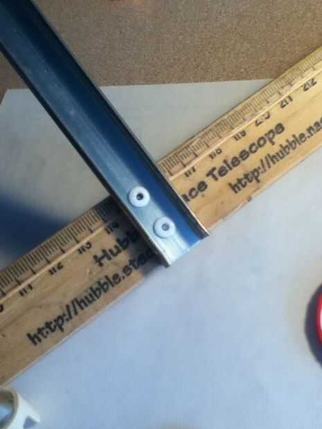Perforé dos agujeros pequeños en la regla y el C-channel. Es muy importante que las dos piezas son cuadradas, por lo taladré un agujero en cada una, remachada y utilizado que como una bisagra para mantener ambas piezas constante para el siguiente hoyo y remache.