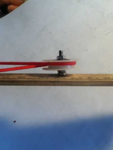 Taladré agujeros en la regla en las marcas de 3" y 9". Despeinarte el hardware a través de la regla he añadido espaciadores de la elevación de las poleas fuera la regla. Esto evitará que la banda de frotamiento en el canal. Para mi hardware tuve que usar dos tuercas para cada polea como espaciadores, con un tercero para garantizar las poleas en el lugar.