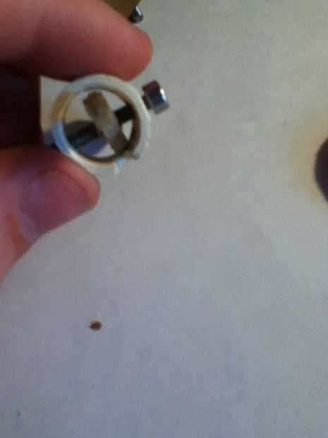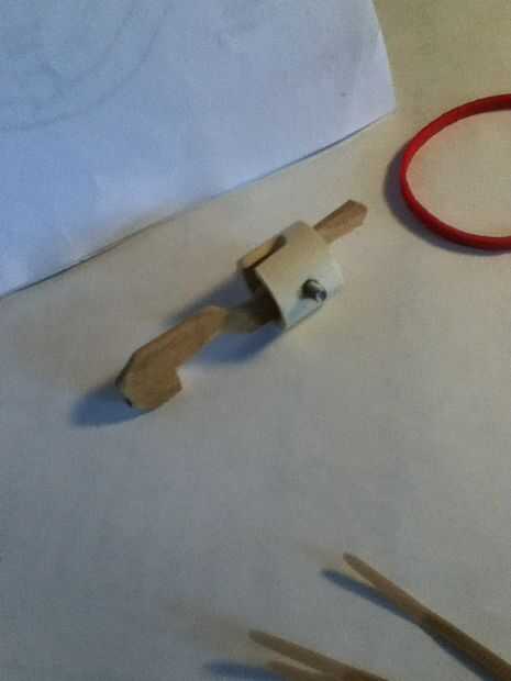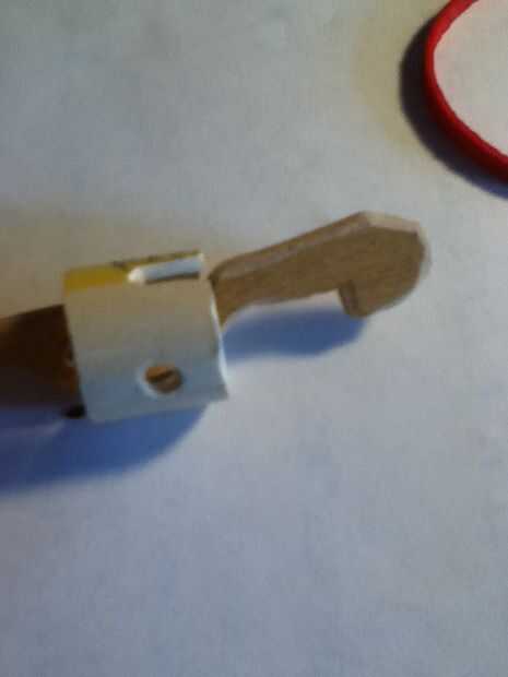 En primer lugar, inserte la captura del gatillo, la pieza de madera, en la bodega de gatillo. Se refieren a la imagen para ver cómo alinea.