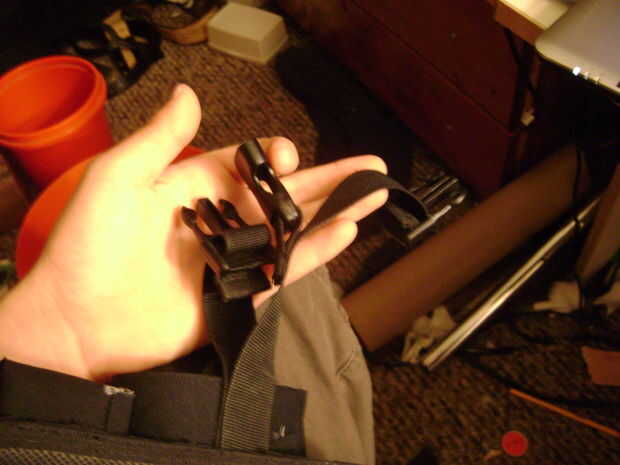 4. esta parte es difícil de describir. Ver imagen 1 para ver cómo hacerlo. Es necesario pegar una correa larga hebilla a la correa de la mitad masculina de la hebilla que pegado en el paso 2. Cortan por la mitad femenina de la hebilla que a pegado muy corto, luego pegamento a la cinta de la hebilla macho a pegado en la. Por favor, busque en el cuadro esta uno, hará las cosas mucho más fácil.