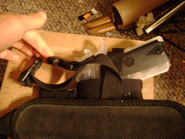 2. Coloque su arma en la funda, luego pegamento en ambas mitades de las correas de la hebilla como se muestra en la figura 2, estas hebillas sostenga la pistola en la funda cuando estás corriendo o moverse mucho.