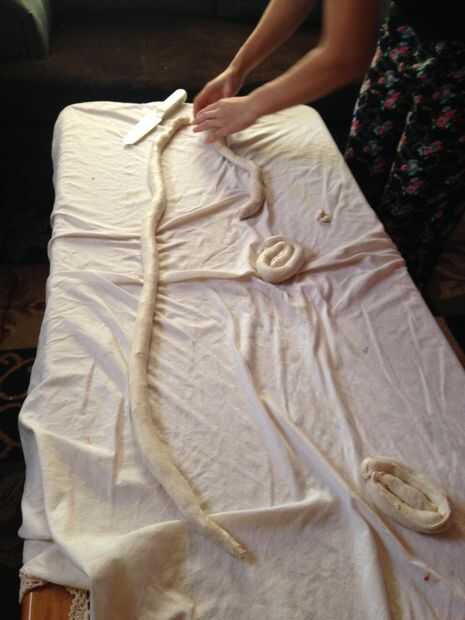 Para este paso todo lo que haces es rodar sus largo rollos en la mirada de un rollo de canela por igual. Se puede ver que tus rollos tenga una corteza más gruesa en los extremos, así que solo les cortó.