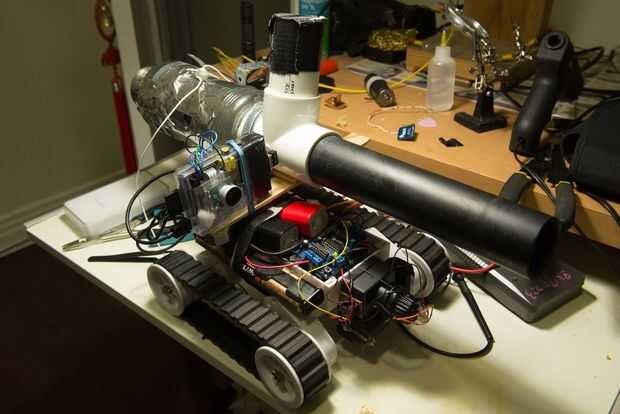 El PiTank es un tanque de controlador web construido para un concurso en el club de robótica de la escuela. El proyecto tomó cerca de dos semanas para terminar con los 5 miembros del equipo participando en varios aspectos. Su proyectil principal son pelotas de ping pong (hasta 3). El mecanismo de disparo se basa en una pistola de puntal. El PiTank es controlado mediante un navegador web y es capaz de streaming de vídeo en tiempo real. Es accionado por un Pi de frambuesa y un Arduino, junto con algunos otros componentes. Aquí está una foto del proyecto terminado y una demostración de vídeo.