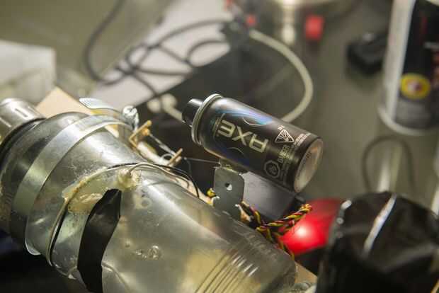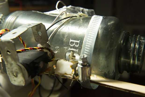 Usted tendrá que hacer 2 agujeros para insertar los cables de bujía (imagen 2) y un agujero más grande para rociar el propulsor (imagen 4). Puede que necesite experimentar un poco para encontrar el tamaño correcto del orificio, ya que la relación aire/combustible es importante para lograr la ignición. Para el propulsor, usé Hacha bala montada sobre un servo (ver imagen 4). La parte superior de la lata debe apuntar hacia el lado derecho de la imagen. Cuando se activa el servo, se presione hacia abajo en la lata de Axe y rociar en la cámara de ignición.
