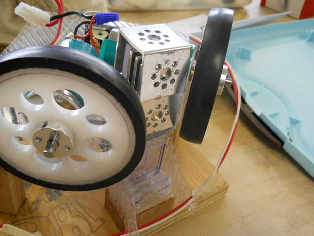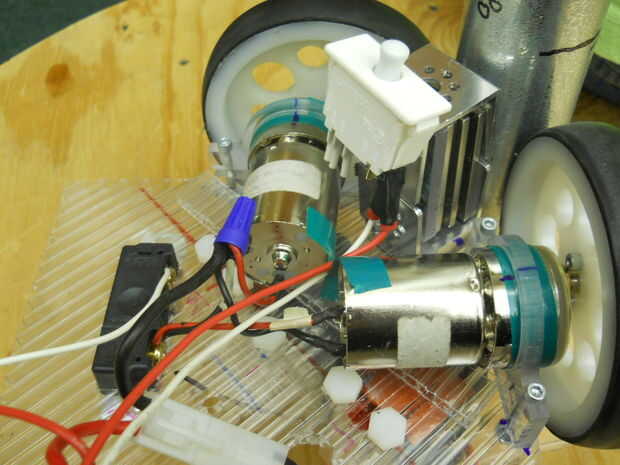 • En la plataforma, hay un botón de resorte. Esto mantiene el minibot en lugar durante el partido. El botón utiliza una llave hexagonal de 1/16 para quitar si es necesario, pero ten cuidado debido a la primavera; el botón podría volar. El botón está conectado a una varilla roscada que se encuentra dentro de un tubo de aluminio. Esto está conectada por dos tornillos en la parte inferior de la plataforma que se encuentran en el soporte de aluminio. Esto proporciona soporte para el sistema de botón. La parte posterior del botón tiene una pieza de aluminio que contiene dos tornillos cortos de plástico que tienen el tubo de aluminio alrededor de ellos. Estos mantener el minibot en su lugar durante el partido.