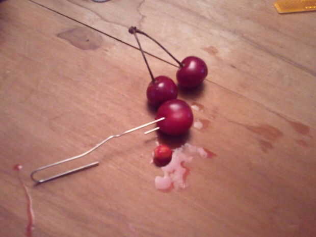 Quitar el tallo. Inserte el clip y con un movimiento scooping, afloje el hoyo y sacar del hoyo. Por alguna razón, el hoyo no salen, pellizque el cable para hacer un pequeño 'scoop'. Usando esta técnica, enfrentó a 8 tazas de cerezas en 1-2 horas. No estoy muy seguro de cuánto tiempo tomó debido a que es un método simple, miraba TV y pierde noción del tiempo.