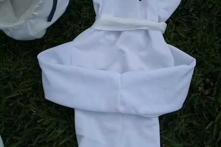 La base del traje es una prenda de una sola pieza. mina había hecha de tela, pero uno podría comprarse en una tienda que vende ropa o disfraces. No quería las manos o guantes para ser visto, así que cosieron la mayoría de los extremos de las mangas. Sin embargo, hay una pequeña abertura entre los extremos de las mangas, para que una mano para ir de en caso de que el usuario quiera utilizar una mano.