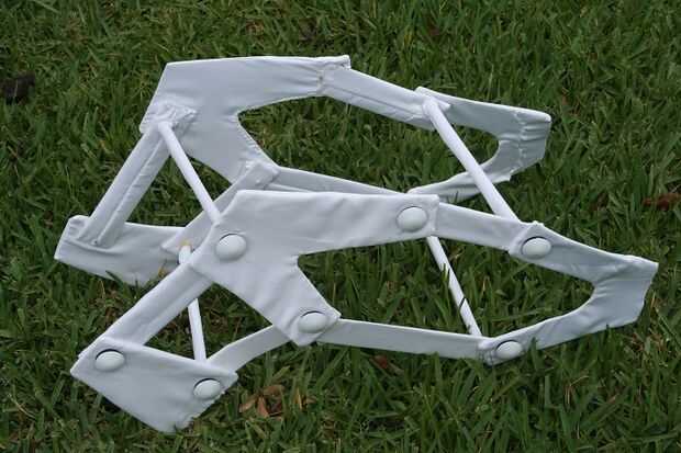 El marco y la jaula para el traje se hace de tablero de lámina perimétrica que he cubierto de tela. Hay tacos de tela cubierta que van entre los 2 juego de bastidores laterales. Las piezas estaban que todas pegan juntas usando un pegamento de silicona fuerte. Luego se añadieron diapositivas muebles para parecerse a las tuercas. El marco se desliza sobre la cabeza y se apoya en los hombros.