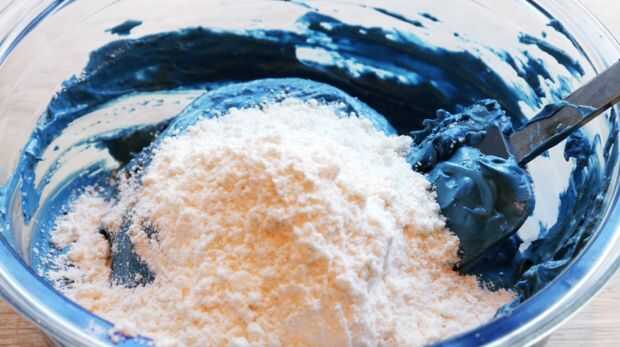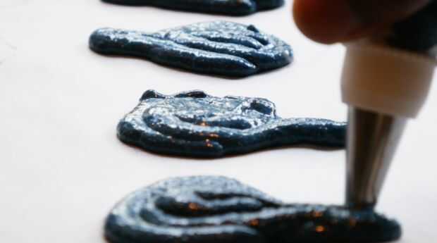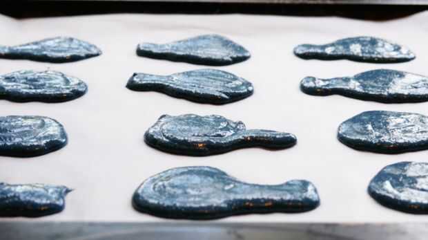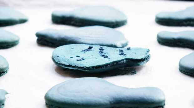 Dibujar una plantilla de Dory y traza esta forma en papel parafinado. Asegúrese de que la mitad de las plantillas son derecha y mitad izquierda. Mezclar el azúcar glas y las almendras molidas conjuntamente en un procesador de alimentos. Tamice la mezcla 3 veces para eliminar cualquier terrón. Añadir las claras de huevo a una batidora y bate a una velocidad media hasta que la pálida y espumosa. Lentamente agregar el azúcar impalpable y mezclar a alta velocidad durante 1 minutos (etapa de pico suave). Añadir el colorante de comida y continuar a batir otro minuto (etapa pico rígido) Agregue la mitad de la mezcla tamizada y las claras de huevo suavemente veces juntos (aprox. 10 pliegues). Añadir el resto de la mezcla seca y doble hasta que la consistencia se asemeja a la lava (pliegues de 30 -40 aprox). Tubo sobre una bandeja de horno forrada con papel parafinado. Golpee la bandeja contra la superficie de trabajo para eliminar las posibles burbujas de aire y dejar que sentarse durante 30 minutos - 1 hora para formar una piel. Hornear a 170 grados C durante 10-15 minutos. Dejar enfriar antes de retirar del papel parafinado.