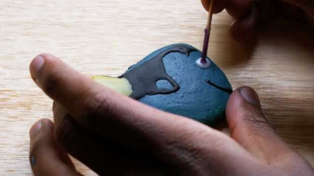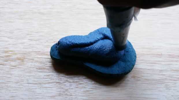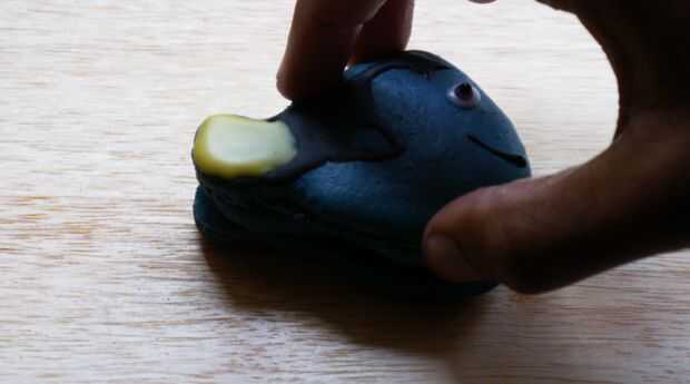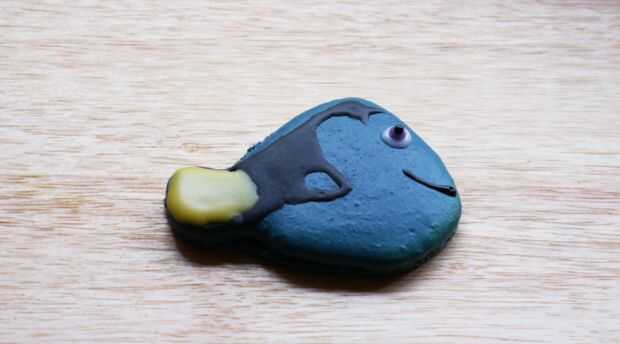 Usando un palillo de dientes y una rastra en la cara de San Pedro con el glaseado de color. Tubería de la ganache sobre la base de uno de los macarons de plano y sandwich junto con un macaron con cara de pez de San Pedro.