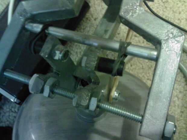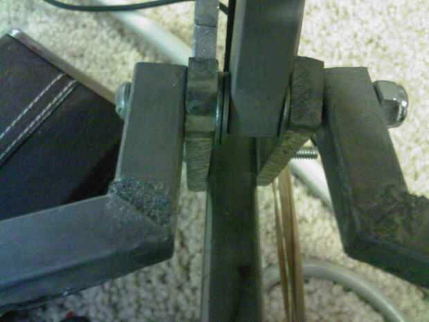 Empezar por la cabeza de conexión a las principales Articulaciones del cuello. Coloque los tres tornillos cortos (1 1/2 '', #8-32) así como sus correspondientes tuercas de tornillo, a través tres agujeros de tornillo de la articulación de cuello. Una vez que ha medido cuánto deben ser los tornillos, corte el exceso usando una sierra para metales. Luego conecte los Soportes rectos a la articulación del cuello (debe ser el soporte con la clavija de resorte en la parte inferior).