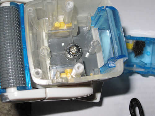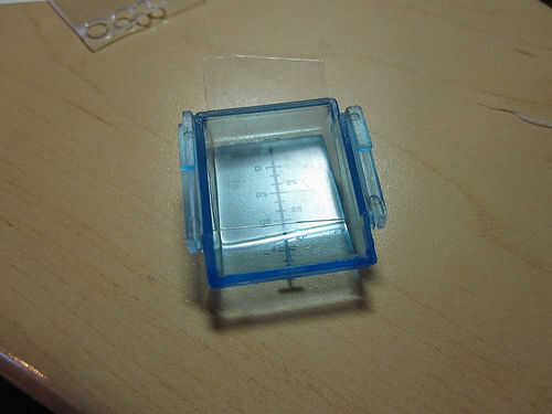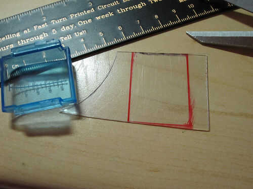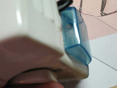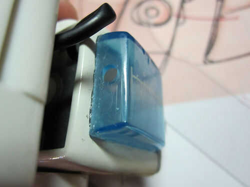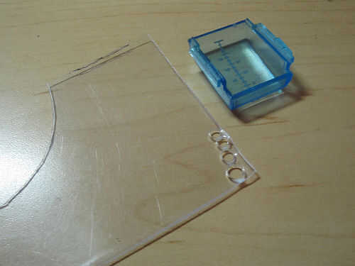 La mochila azul es exactamente 1'' por 1 1/2 '', por lo que usted quiere cortar un rectángulo forma de la hoja fina de plástico.  Este se colocará sobre la espalda que falta, como para crear una sólida contención para la celebración de todas sus soluciones.  Luego usando la herramienta dremel, perfore un pequeño agujero en la parte superior del envase, que puede utilizar para llenar para arriba.  Como un tapón de prueba de agua, usé un borrador de lápiz mecánicos pequeños.