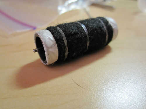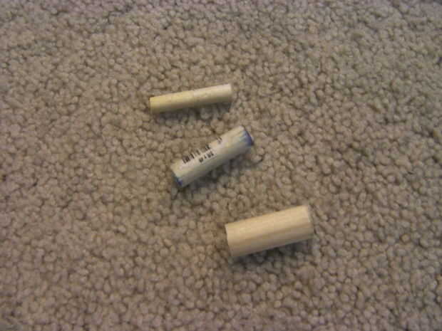 Para el cepillo de fregado fácil, mida la longitud entre cada uno de los brazos y luego cortar un trozo de su clavija de madera. A continuación pegamento caliente la espiga a cada una de las aspas del ventilador (así se puede luego quitar, si es necesario). Luego, tome un pedazo de (negro) fieltro y Envuélvala alrededor de la espiga, que junto con bandas de goma caliente pegamento. Y hay que ir!