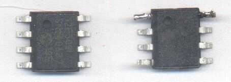 Aplicar un poco de soldadura a los lados superiores de los pines 1 y 8 - que probablemente será más fácil hacerlo ahora que tarde. No se moleste con el pin 4, no se conectará a cualquier cosa.