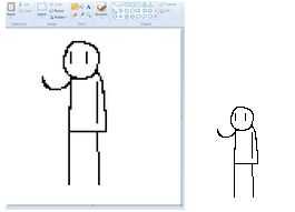 Es un garabato rápido para demostrar. Lo llamamos Steve. La copia de la derecha es la imagen a gran escala. De este tamaño, algunas de las zonas más ásperas de Steve comienzan a buscar más pronunciado: su brazo izquierdo es definitivamente apagado, y hay gotas de píxeles donde la cabeza se encuentra con su cuerpo.