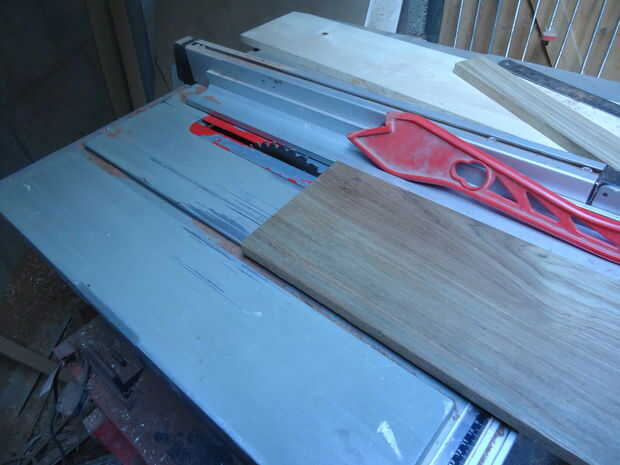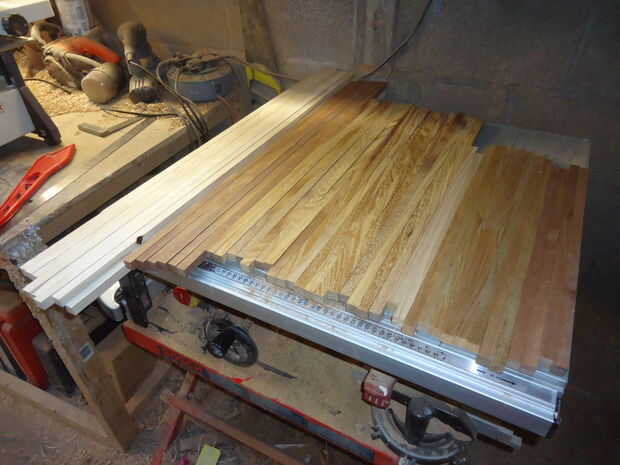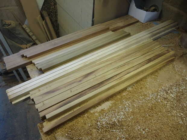 Un borde en cada pieza fue cepillado cuadrado, entonces vio una barra gruesa de 16mm cortada sobre la mesa. Esto se repite hasta que todo fue 16mmx15mm varillas con 3 lados cuadrados cepilladas.