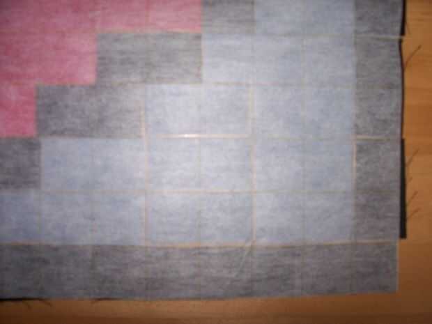 Una vez que el tejido de pixel listo, cortar un 20 "x 20" pedazo de la red de fusible. Ponga la red fusible en la tabla con los 'baches' hacia arriba. Este es el pegamento que sostenga a la tela en su lugar mientras trabajas. Tenga en cuenta que las líneas de rejilla están en la parte posterior de la red de fusible, pero todavía se puede ver a través de la ligera, adhesiva. Me gustaría trabajar en filas, rellenando unos 5 o 6 hileras siguiendo mi patrón. Cuando tengas unas pocas hileras establecidas, presionar bien con la plancha para mantenerlos en su lugar. Tenga cuidado de no tocar la plancha a la red fusible desnuda, se pegan a la plancha y hacer un lío!