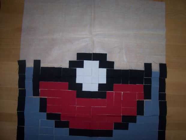 Comience cortando la tela coloreada. Puesto que los 'píxeles' son 1 "x 1" me gusta hacer una combinación de 1 "x 2" (para rellenar áreas grandes) y 1 "x 1" (para áreas de detalle).