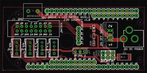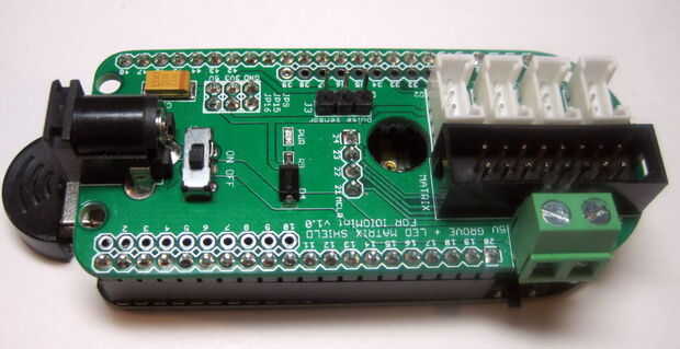 se sienta encima de IOIOMint para las conexiones de matriz de LED (proteger archivos Eagle CAD). PIXEL viene con