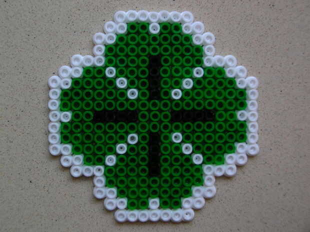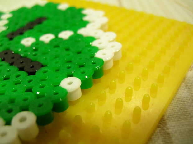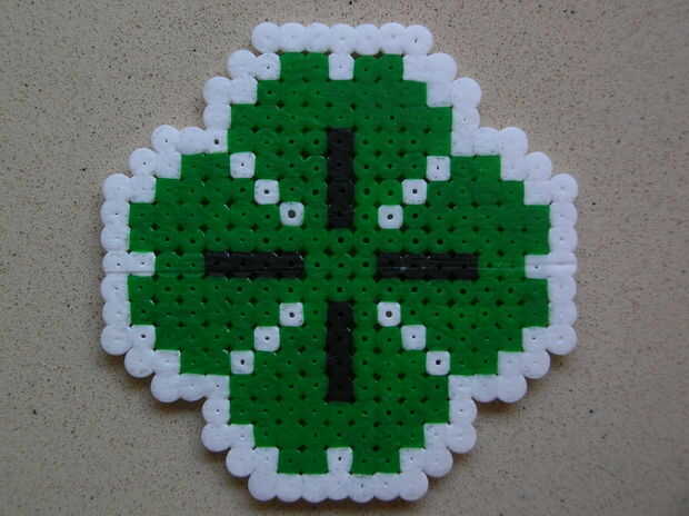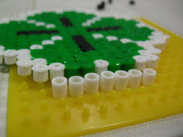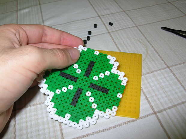 Si su patrón es demasiado pequeño (que viene con pyssla de Ikea de granos, por ejemplo) en este momento tendrás un trébol incompleto. Simplemente ponlo en el patrón una vez más, como en las fotos, así que puede Agregar las filas adicionales a la izquierda y luego hierro otra vez como en el paso 3.