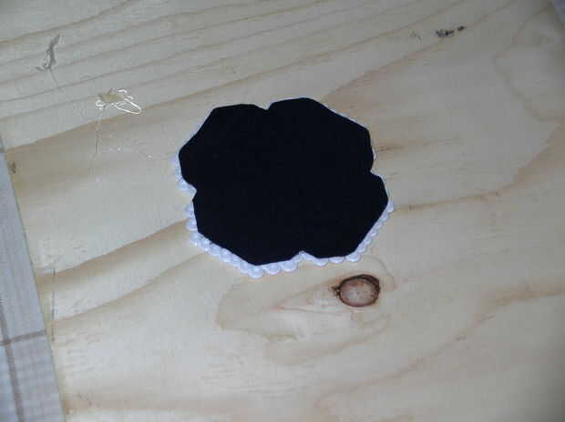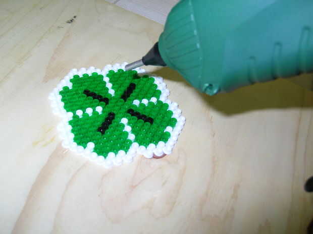 Toma tu pistola de pegamento caliente y poner pegamento en la base del trébol (el lado donde los granos no son planos por la plancha y todavía hueco). Rápidamente ponga la pieza de fieltro sobre él y presione hasta que el pegamento seque.