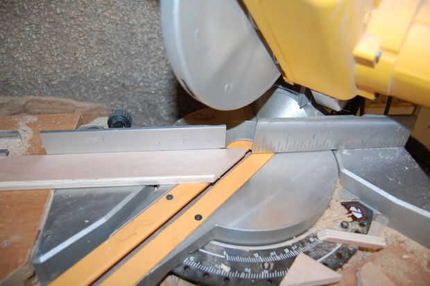 En la Sierra de mesa corté unas tiras de 50mm de un trozo de contrachapado de 12mm. Luego la hoja en ángulo y les dio un bisel, antes de cortar a la longitud de la Sierra de inglete.
