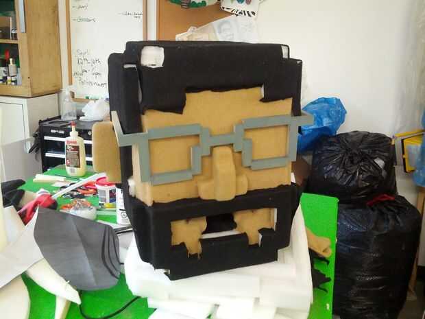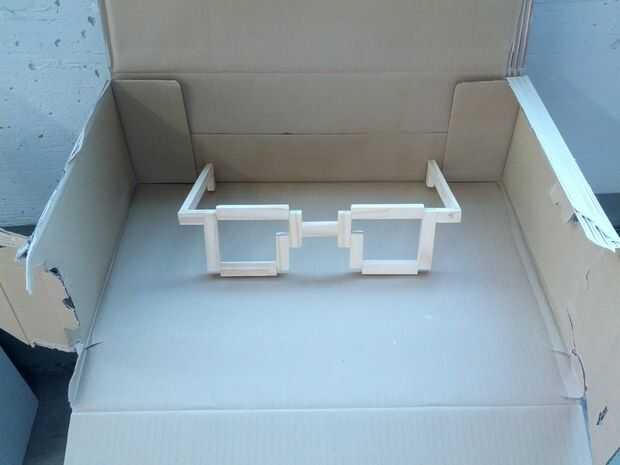 Pixel-como gafas fueron también construidas de clavija de madera rectangular y aerosol pintado gris.