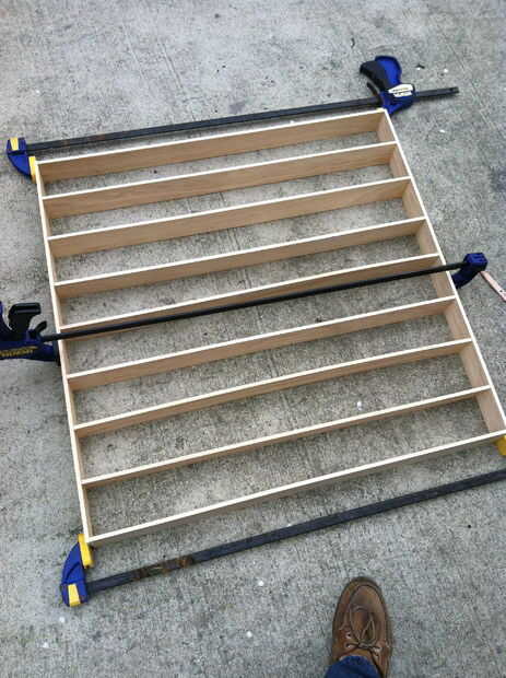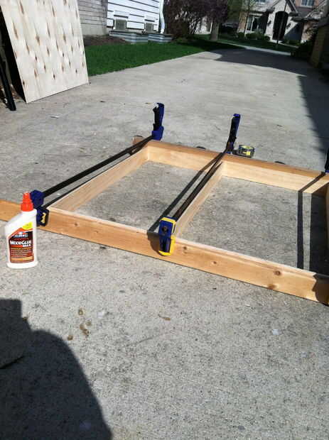 Sus barras y crear un marco básico, sujeción juntos y apoyando el centro con un tablero extra o dos. Colocar grandes piezas de madera en el exterior del marco (antes las abrazaderas) para distribuir la presión. Asegúrese de que la caja es cuadrada y pegamento.