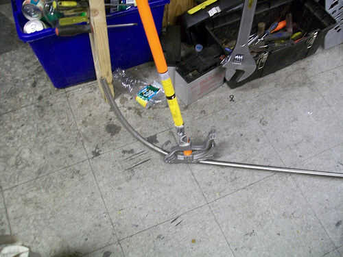 Normalmente utilizo Dobladoras de tubo para poner solo curvas en la tubería del metal, pero ¿qué pasa si ponen una pequeña curva en el tubo, luego movió el doblador de dos pulgadas a lo largo de la tubería y lo hizo de nuevo? Si estaba liso sobre él, podría conseguir el tubo bastante cerca de un círculo. Corte un 2 * PI la longitud de la tubería y le dio un tiro.