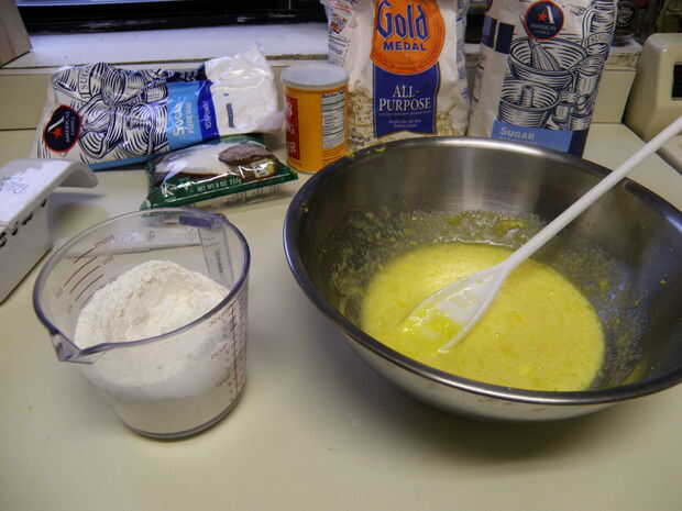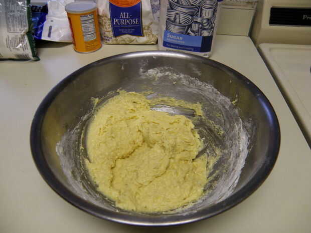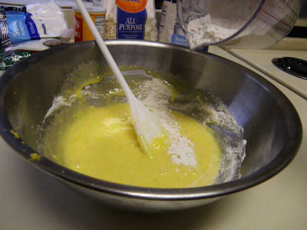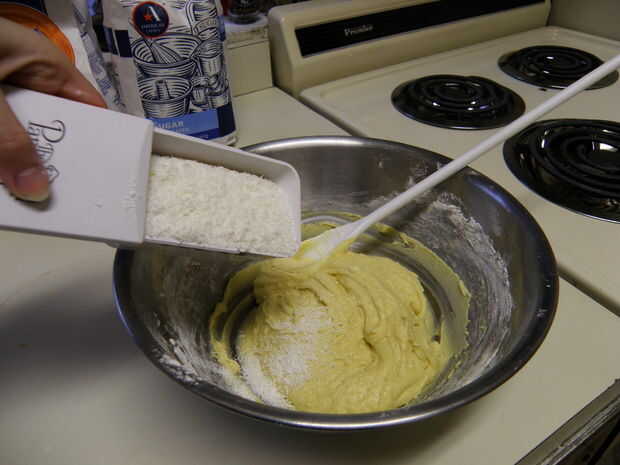 Poco a poco añadir la mezcla de harina a la mezcla de mantequilla, batiendo hasta que quede mezclado y suave. Este será un poco espesa! Agregue el coco una vez bien mezclado.