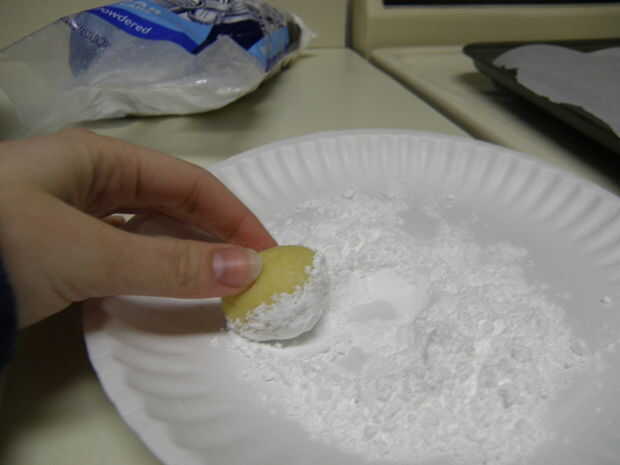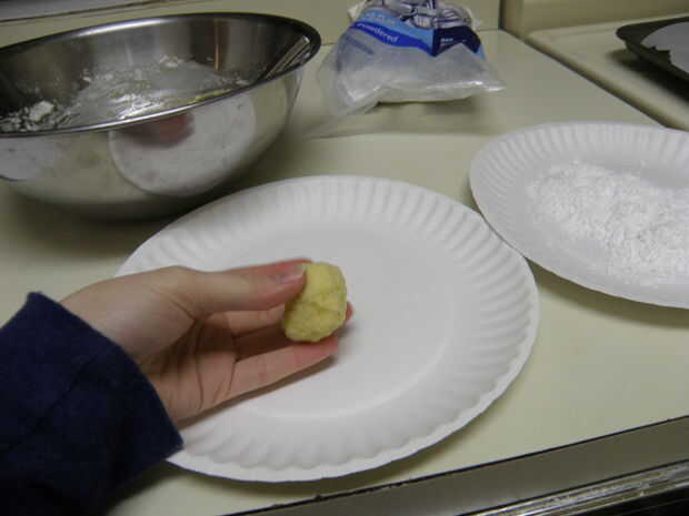 Consejo: lavarse las manos con frecuencia, o las manos recibirá demasiado pegajosas para formar las bolas correctamente. Además, forma la masa antes de lanzarlos todo en el azúcar en polvo, esto será recortar el tiempo.