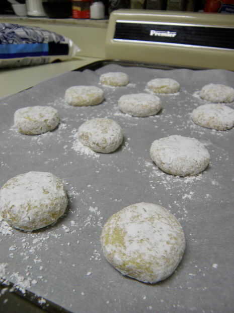 Coloque las bolas de 2 pulgadas aparte en la hoja de galleta. Usted debe ser capaz de encajar una docena a la vez. Presionan hacia abajo un poco para ayudarlos a hornear uniformemente.