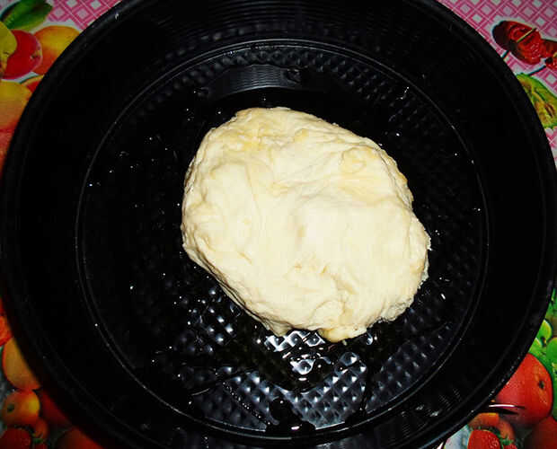 Extender unas gotas de aceite en la bandeja para horno luego tomar sobre la mitad de la masa y poner en lata luego, presionando con los dedos para darle la forma adecuada a él.