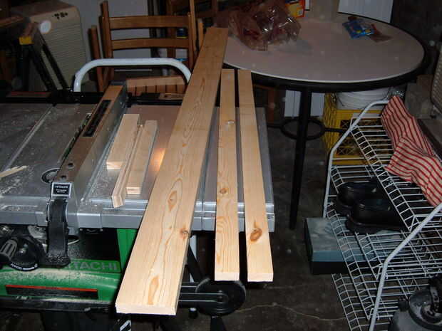 A continuación es el momento para cortar el material del marco. El primer corte es a la longitud aproximada, así que corte el tablero de 8' en 3' pedazo de pieza y 5'. El segundo corte es ripear las dos piezas por la mitad, para que tengas todas las cuatro piezas del marco. Desde el 1 "x 4" es en realidad 3/4 "x 3 1/2", cuando la ripee en medio ti no será 1 3/4", sino más bien como 1 5/8, o tal vez incluso más pequeños. Realmente depende del corte de la hoja de corte que se utiliza, más probable será 1/8". Así que asegúrese de ajustar sus medidas.