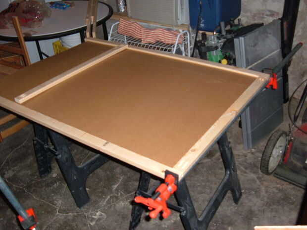 Esto es cuando usted va a necesitar abrazaderas para unir este lío. Voltee el tileboard y deslice en las piezas del marco lado largo, parte grasa hacia arriba. Tome una breve del marco de la aplicar el pegamento en cada extremo y deslice lado, grasa hacia arriba. Luego la Plaza de la esquina y poner una abrazadera de tubo a tal fin. Repita en el otro extremo. Puede que necesite utilizar un mazo de goma para asegurarse de que todo es uniforme. Cuando estás feliz, disco Inicio los tornillos de bolsillo. Dejar todo en las mordazas para al menos una hora en coche.
