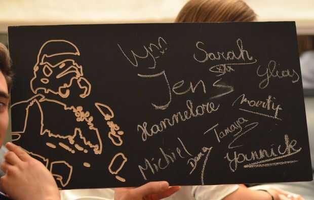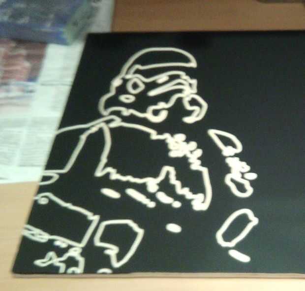 Las dimensiones finales son aproximadamente 32 x 50 cm de los cuales aproximadamente 1/3 está cubierta con grabados de los soldados de asalto. Estoy muy satisfecho con el resultado, he aprendido algunos trucos con mi máquina y sobre la madera y pintura de pizarra por lo que yo diría fue una diversión correr!