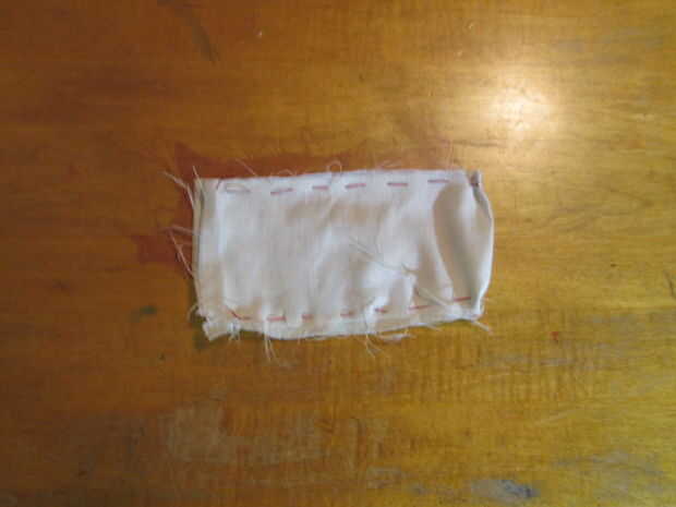 Muy sencillo empezar: se dobla sobre y coser las dos mitades juntas a lo largo del lado. Sin embargo, porque esto es una envoltura/cubierta, deberemos dejar la tapa abierta y agradable. Sé que no se ve muy, pero solucionaremos más adelante. También, no importa el color del hilo de rosca (no incluso vemos el hilo cuando terminemos; Escogí rojo para la visibilidad en las fotos). No te olvides de atar cada extremo de su hilo.