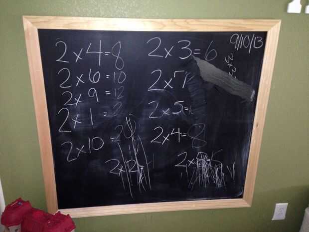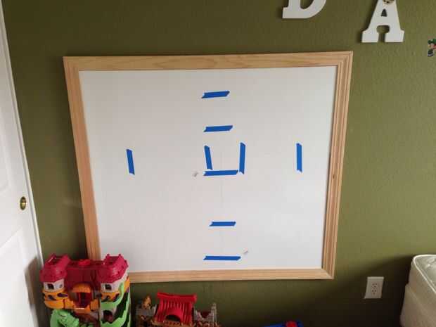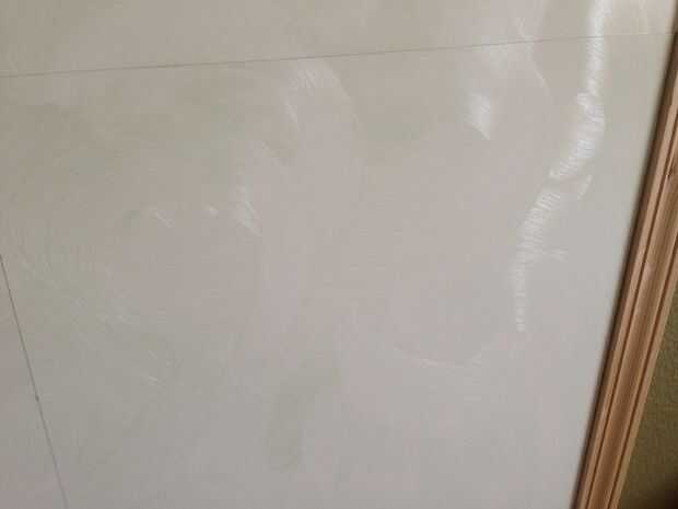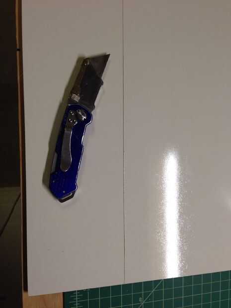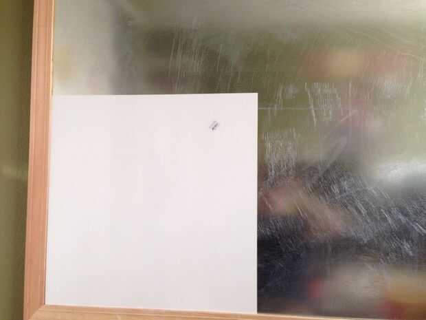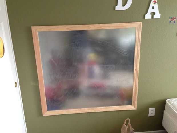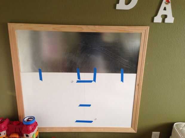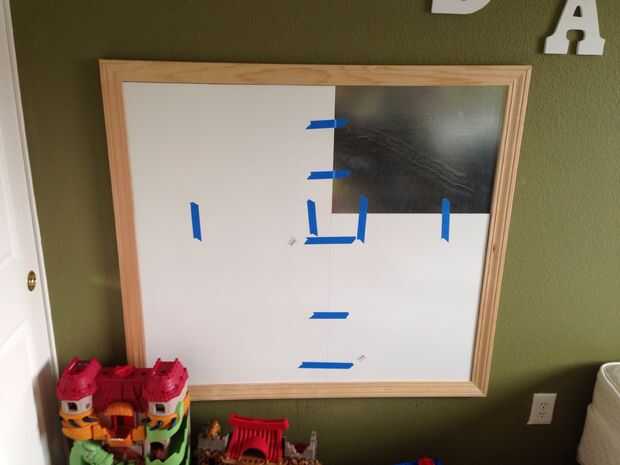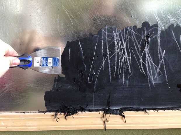 Primero raspar la pintura de tiza. Salió muy fácilmente con una espátula de hoja ancha. A continuación, he comprado melamina de mi almacén local del hardware. La melamina es un tipo de tablero con una fina capa de plástico y se utiliza generalmente para la fabricación de gabinetes blancos. Este tablero de la melamina fue específicamente para el uso como una seca al tablero del erase y solamente 3/16" de espesor. Está disponible en hojas de 4' x 8' pero eran todos de eso así que me compré cuatro tableros de 2' x 2'. Una hoja completa se vería más bonita porque no sería cualquier costuras, pero esto funciona.