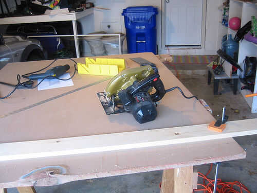 Saw(s): hice todo el corte con una sierra circular, utilizando una cuchilla de corte transversal para el 2x4s y un compuesto para el resto. Si no molan (como yo no lo soy) una no tiene una tabla vio, también puede utilizar algún hierro de ángulo recto acero y abrazaderas para proporcionar una guía para la sierra.