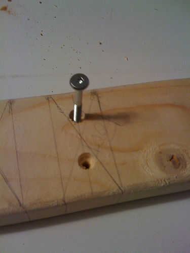 Estas líneas sirven como directrices para los próximos pasos. Marcar un punto en cada línea de centro que es 1,5 en cada borde. Si está usando insertos roscados como yo, necesita perforar un orificio de 1/4" en cada punto marcado. Si vas a usar un perno en su lugar, simplemente perforar el agujero piloto de tamaño apropiado. Tenga cuidado que es el tamaño correcto, que no desea que su madera para dividir.
